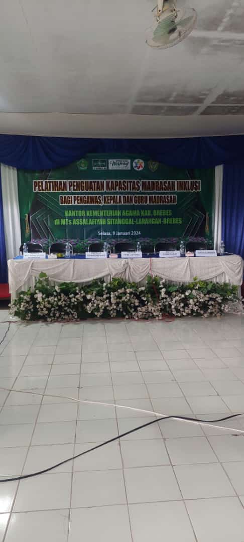 Brebes, (9/1/2024) – Kementerian Agama Kabupaten Brebes mengadakan Pelatihan Penguatan Kapasitas Madrasah Inklusi Di MTs Assalafiyah Sitanggal Kecamatan Larangan Kabupaten Brebes selama satu hari yang dihadiri oleh Kepala MI, MTs dan MA serta perwakilan guru di wilayah Kecamatan Larangan. MTs Assalafiyah Sitanggal nantinya diharapkan menjadi contoh madrasah inklusi untuk madrasah-madrasah lainnya.